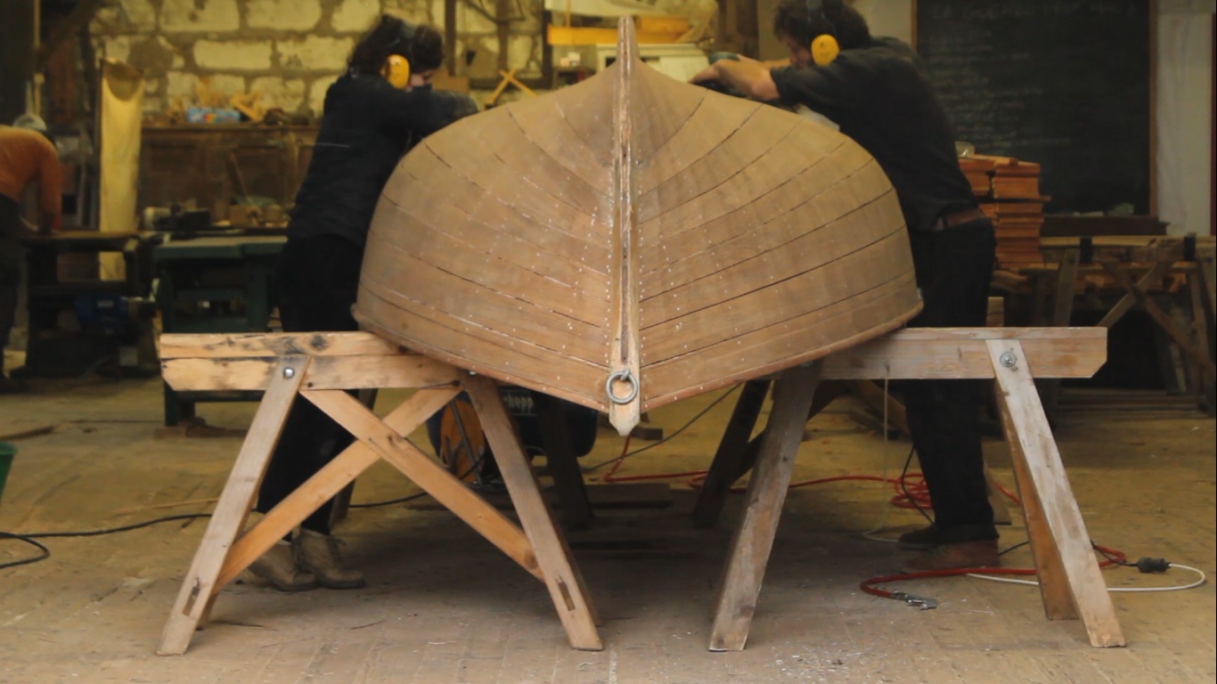 La barque se caractérise par une construction à franc-bord en bois d’iroko, matériau exotique introduit en France au cours des années 40, montrant l’évolution des approvisionnements et savoir-faire artisanaux. Ses formes simples, ouvertes et élancées, combinées à un petit pont avant, illustrent une typologie vernaculaire adaptée à la navigation lacustre. La barque a récemment reçu un gréement au tiers, ajouté de manière réversible et cohérente avec l’esprit traditionnel, ce qui démontre la capacité d’un tel bateau à rester vivant tout en respectant sa conception d’origine.Témoignage événementiel ou d’une activité révolue :